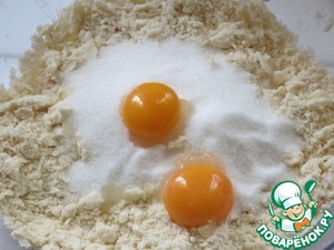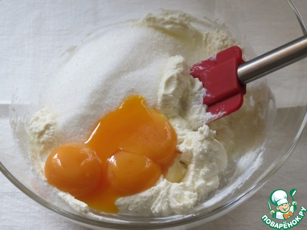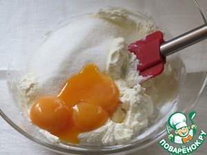 • Перетереть ложкой рикотту, добавить желтки и сахар, всё хорошо перемешать.