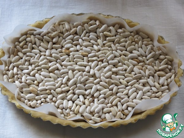 • Покрыть пергаментом и положить сверху сухую фасоль. выпекать в духовке при 180" - 15 минут.