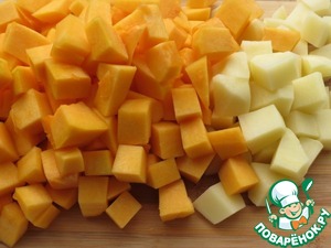 Нарезать кубиками картофель и тыкву. -
