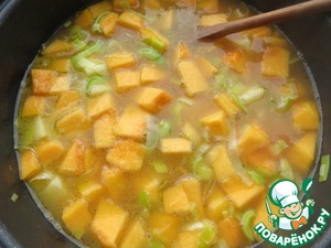 Добавить тыкву и картофель, перемешать, подержать на огне 3 минуты.