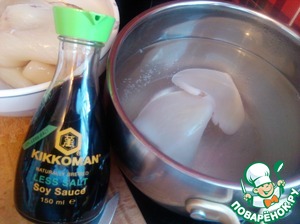 Тем временем на другой конфорке у нас закипела вода. Наливаем в нее соевый соус "Киккоман" (количество не указываю, наливайте по вкусу). Кладем в нее кальмара и варим 5 минут.