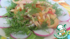 3. Кальмар опустить в кипящую воду на 10-15 секунд, достать, почистить и нарезать кольцами.