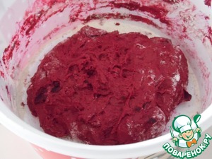 Дрожжи развести в воде, влить масло, добавить3/4 стакана запечной и натёртой на тёрки свёклы, посолить, всыпать муку и замесить тесто, руками (тесто очень-очень липнет к рукам, получается липкое). Переложить тесто в миску смазанную оливковым маслом. Накрыть миску пищевой пленкой и поставить в теплое место на 1 час, пока тесто не увеличится в 2 раза.