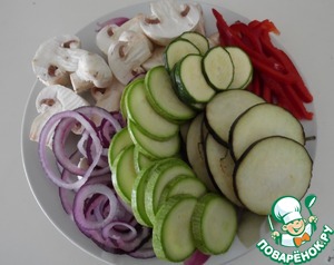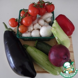 Пока тесто подходит, займёмся начинкой. Нам понадобится -мало оливковое 10мл, соусом "Териаки"2ст. л, цуккини 1шт, кабачок 1шт, баклажан 1шт, перец сладкий 1шт, помидоры черри 5штук, фенхель 1шт, лук красный 1шт, грибы шампиньоны 10шт, чеснок 2 зубика, перец острый.