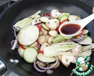 Нагреть сковородку с маслом, должна быть очень горячая. Первое вносим лук, затем фенхель, грибы, соус"Териаки", баклажан, и затем всё остальное, помидоры и чеснок последними, ещё 1мин и выключить. откинуть на дуршлаг. Остудить