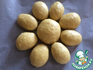 • Подошедшее тесто разделить на 8 равных частей (каждая часть весом около 78 г) и 1 побольше (140 г. примерно)