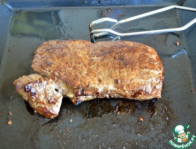 7. Слить маринад с мяса и вытереть его бумажной салфеткой. Разогреть масло в большой сковороде и обжарить масло на среднем огне с обеих сторон и с боков по 5 минут или до желаемой готовности. Выложить обжаренное мясо в тарелку, плотно обмотать фольгой и оставить доходить и «отдыхать».