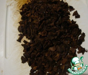 Сухие грибы хорошо промыть, залить кипятком и оставить на 2-3 часа разбухать и настаиваться. Затем варить их в этой же воде на небольшом огне в течении 30 минут. Отвар не выливать.