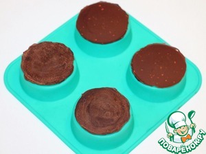Берем силиконовые формочки, переворачиваем их как на фото и смазываем верх (чайной ложкой) растопленным шоколадом. У меня получилось 12 кружочков (Ф ~6 см), т. е. на четыре пирожных по три кружка. Вместо формочек можно взять силиконовый коврик или пергаментную бумагу (смазать маслом). Кружочки отправляем в холодильник до застывания шоколада. Застывшие кружочки слегка поддеваем ножиком и они легко снимаются с формочки.