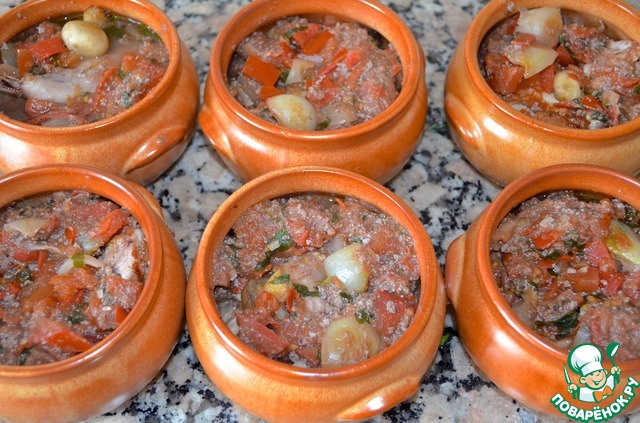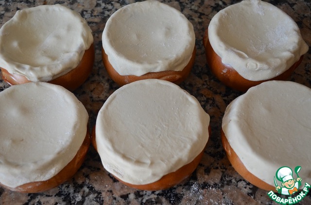 8. Тесто разделить на 6 кусочков и раскатать каждый достаточно тонко. Накрыть горшочки кругами теста и поставить в духовку запекаться на 30-35 минут при температуре 200С.