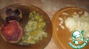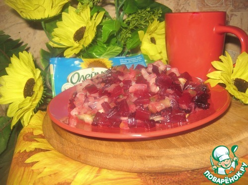 Лук нарезать кубиками, свеклу испечь (сварить-кто как любит. я же предпочитаю печёную-она слаже)