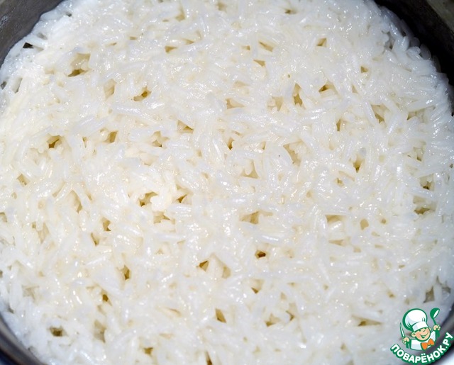 Рис отварить, согласно инструкции на упаковке. Откинуть рис на дуршлаг и промыть под струёй холодной воды, чтобы смыть лишнюю клейкость.
