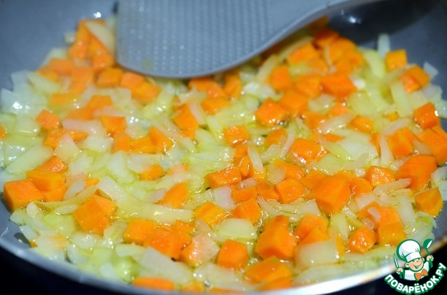 Обжарить лук и морковь на подсолнечном масле около 3 минут.