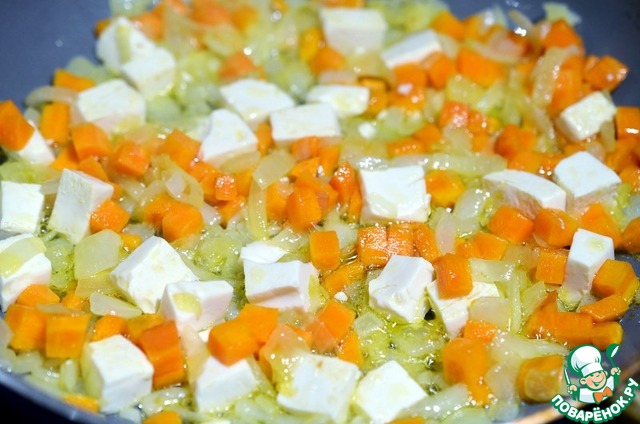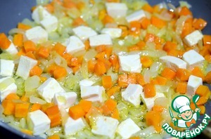 Добавьте к луку с морковью и обжаривайте до золотистого цвета.
