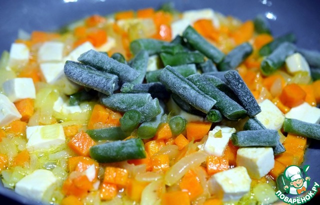 Добавьте замороженную зеленую фасоль, обжаривайте минут 5.