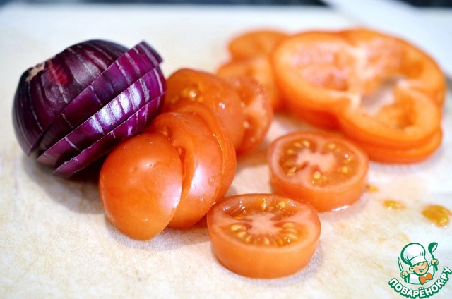 Лук и помидор нарезать кружками, перец пластинками.