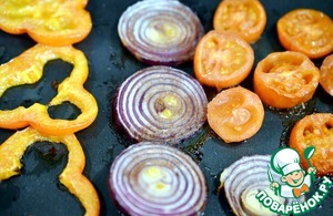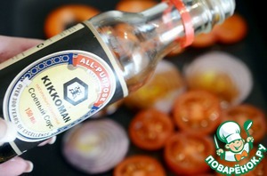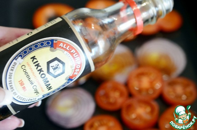 Выложить овощи на противень. Полить соевым соусом Kikkoman.