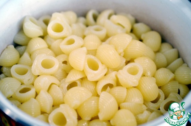 Пасту отварить до полуготовности (аль-денте), слить воду, заправить чуть-чуть подсолнечным маслом.
