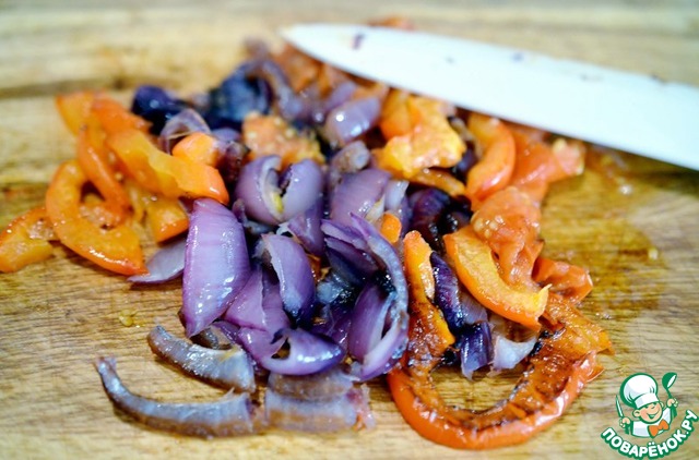 Запечённые овощи нарезать ножом произвольно.