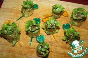 На кабачок Выкладываем полоску салата, сверху - начинку, закручиваем рулетом (чтобы завитушки зелени выглядывали), закрепляем шпажкой. У меня получилось 8 шт.