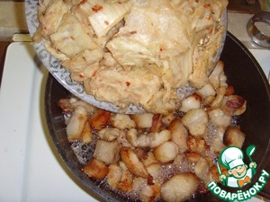 Чимчи, предварительно порезав, добавляем в сковородку (у меня чимчи уже было порезано ещё на этапе засолки).