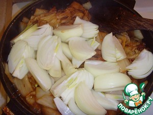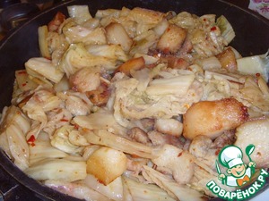 Блюдо готово. На фото видно, что вся вода выпарилась, капуста жарится в топлёном сале.