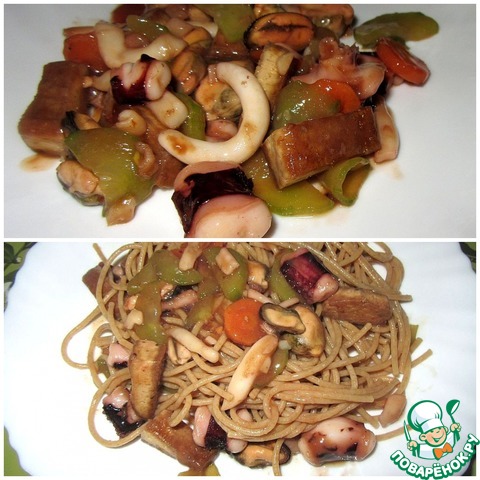 Добавляем к овощам любые морепродукты или морской коктейль. У меня осьминоги, мидии, кальмар и креветки.