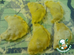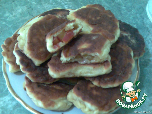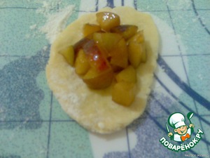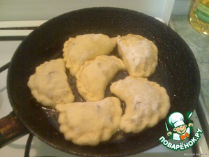 Тесто раскатать в колбаску и разрезать на порционные кусочки, затем из этих кусочков раскатать кружок, положить начинку и защипывать как вареник. После края сделать ажурными, чтобы пирожок не расклеился.