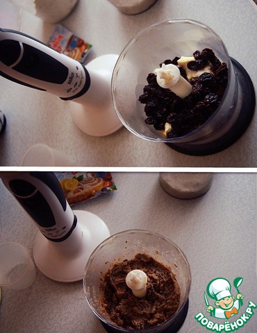 Изюм вымочите мин 5 в горячей кипяченой воде и порубите блендером. Положите в чашу мягкое масло, сахар, корицу, ванильный сахар, изюм и хорошо размешайте с помощью блендера до получения практически однородной массы.