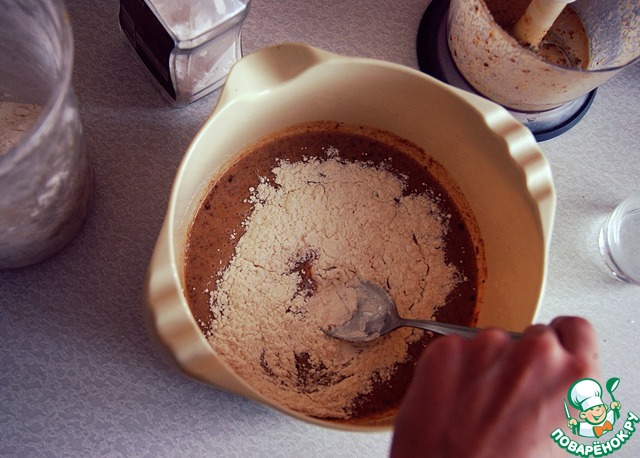 Всыпьте пшеничную муку и соду, замесите тесто, оно должно слипнуться в комок. Если суховато, можно добавить еще воды.