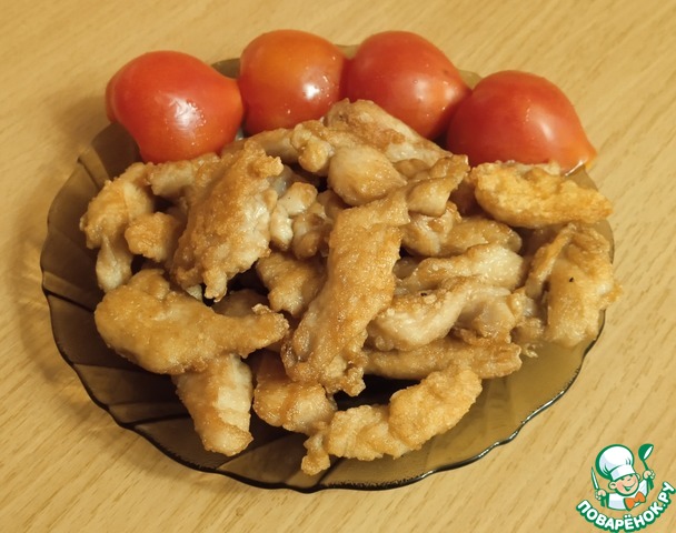 Маринованные в соевом соусе кусочки куриной грудки перемешать, равномерно посыпать крахмалом и перемешать ещe раз. Выложить кусочки курицы на сковороду в раскаленное масло, по возможности разделить на отдельные кусочки при помощи кулинарной лопатки и обжарить равномерно со всех сторон на сильном огне, периодически помешивая. Куриное филе жарится очень быстро, так что если вы решите подать к нему гарнир, то позаботьтесь о нeм заранее.