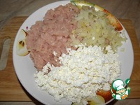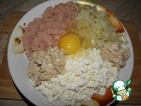В куриный фарш ( если мясо целиком, пропустить через мясорубку), добавить обжаренный лук и творог ( творог можно через блендер, а можно раскрошить..) |