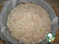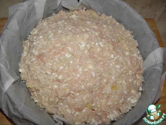 В форму ( если надо постелить бумагу, смазать маслом) выложить 2/3 фарша, сделать небольшие бортики, в серединку начинку, ( чуть посолить) |