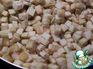 Обжариваем в масле до готовности минут 7-8 с добавление соли и куркумы.