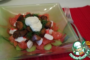 Предлагаю вашему вниманию вкуснейший, нежнейший и сытнейший салат! Вкус этого салата ассоциируется у меня с песней уважаемой Софии Ротару "Вкус любви": сочетание сладости грейпфрута, горечи сельдерея и "жаркой" курочки! Любителям творчества Софии Ротару и горько-сладкого вкуса, посвящается! Идею рецепта прочитала в книге "Кулинарные прописи" 2009г., с моими дополнениями.