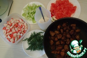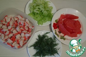 Грейпфрут очистить от плёнок, разделить руками на мелкие кусочки, чтоб сохранить больше сока. Сельдерей нарезать мелкими кусочками. Крабовые палочки нарезать кусочками средней величины. Подготовить зелень.