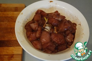 Куриное филе нарезать мелко, добавить соевый соус, раздавленный чеснок, сахар и корицу, перемешать и оставить в маринаде на время подготовки остальных продуктов.