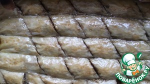 Из 100г сахара, 50мл воды и 1 ст. л. меда сварить сироп, добавить корицу. Вынуть пахлаву, сделать надрезы глубже, полить ее горячим сиропом.