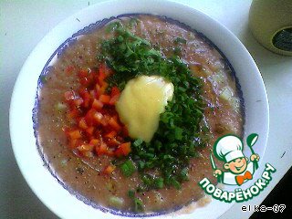 Пока суп охлаждается, нарезать мелкими кубиками сладкий перец. Вареную картошку тоже мелко нарезать и разложить по тарелкам, влить охлажденный суп, в центр насыпать сладкий перец, мелко нарубленную зелень, положить сметану или майонез (я подавала с домашним свежеприготовленным майонезом). Вокруг посыпать черным свежемолотым перцем, полить небольшим количеством растительного или оливкового масла (примерно 0,5-1 столовая ложка). Ну, а теперь можно и пообедать, приятного аппетита!