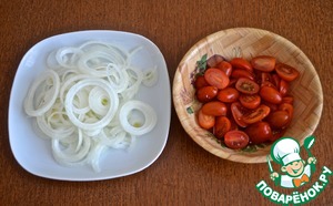 6. Помидоры-черри разрезать пополам, лук порезать тонкими кольцами. Листья салата хорошенько промыть и высушить. Сыр потереть на мелкой терке.