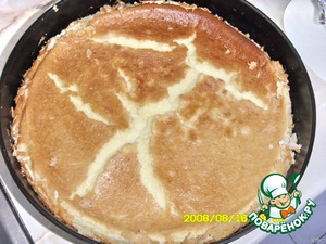 Упустила из виду, чаша с водой была не высокая, видать вода выкипела и чизкейк потрескался. Так что учту на будущее. Кладем в холодильник на 3-4 часа.