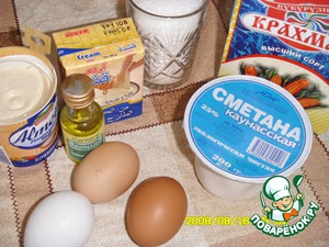 Взбить сливки с сахарным песком, сметаной, сыром, вбить яйца и насыпать крахмал.