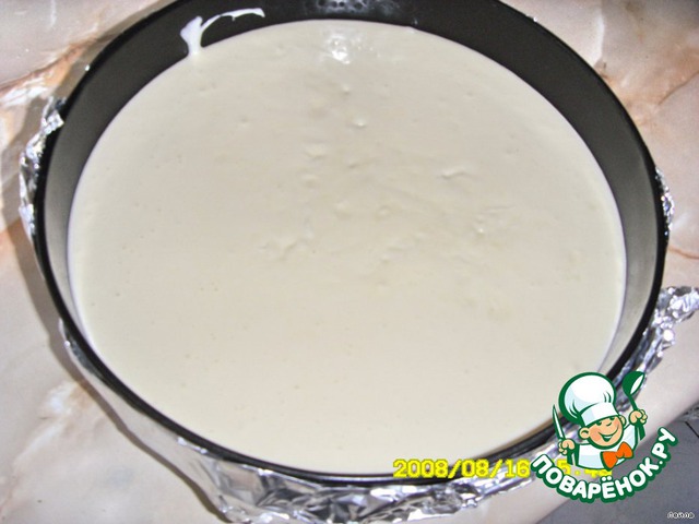 Выливаем на основу. Если форма съемная, обернуть фольгой. Кладем форму выпекать на другую чашку с водой (то есть на водяную баню). Выпекала 75 минут. Выключить и оставить до охлаждения в духовке.