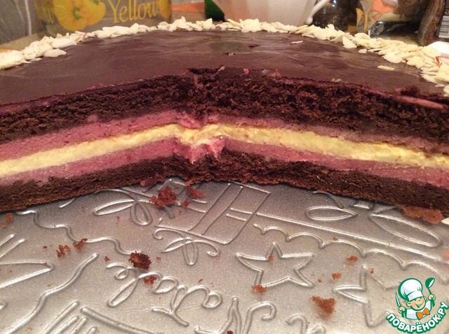 Шоколад растопить на водяной бане вместе с растительным маслом и полить поверхность торта. -