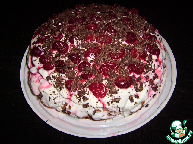 Вариаций торта с вишней множество. Этот торт стал для нашей семьи одним из самых любимых. Мой сыночек всегда просит его испечь на большие праздники. И сегодня моему малышу 5 лет, и у нас этот торт. Приготовление торта несложное и быстрое. Торт выходит очень большим. А сочетание вишни и сметанного крема даёт незабываемый, изумительный вкус. Торт особенно вкусным получается с консервированной вишней. Сразу извинюсь за скромное украшение торта. Мой сыночек не любит шоколад (вообще не ест шоколад в любом виде), орехи. А вот в таком приготовлении торт ест с удовольствием. Вы можете украсить торт, как Вы любите. Я просмотрела тортики с вишней на сайте, и такого не нашла.