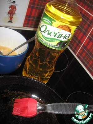 Нагреть сковороду на которой вы обычно жарите блины, кисточкой смазать её маслом"Олейна"