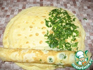 На первый блинчик насыпаем зелень заворачиваем рулетом. Затем на второй блинчик насыпаем зелень, заворачиваем в него первый рулет и т. д.