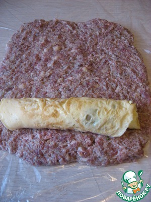 Расстилаем на столе пищевую плёнкку. Выкладываем ровненько фарш. На один край кладем наш яичный "пропеллер"