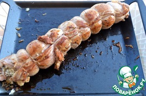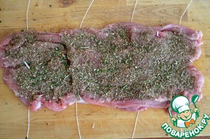 6. Свернуть мясо в рулет и обвязать кулинарной нитью.
