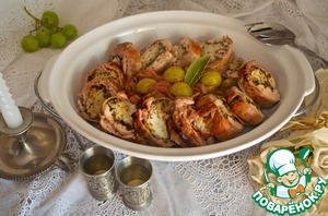 7. Из бекона выжарить жир и убрать. (Сам бекон в этом рецепте не понадобится, поломайте зажаренный бекон на кусочки и используйте вместо крутонов в салате или супе). Обжарить рулет в жире от бекона со всех сторон до золотистой корочки. Переложить в огнеупорную форму, влить бульон, накрыть фольгой и готовить в духовке при 200С 40 минут.